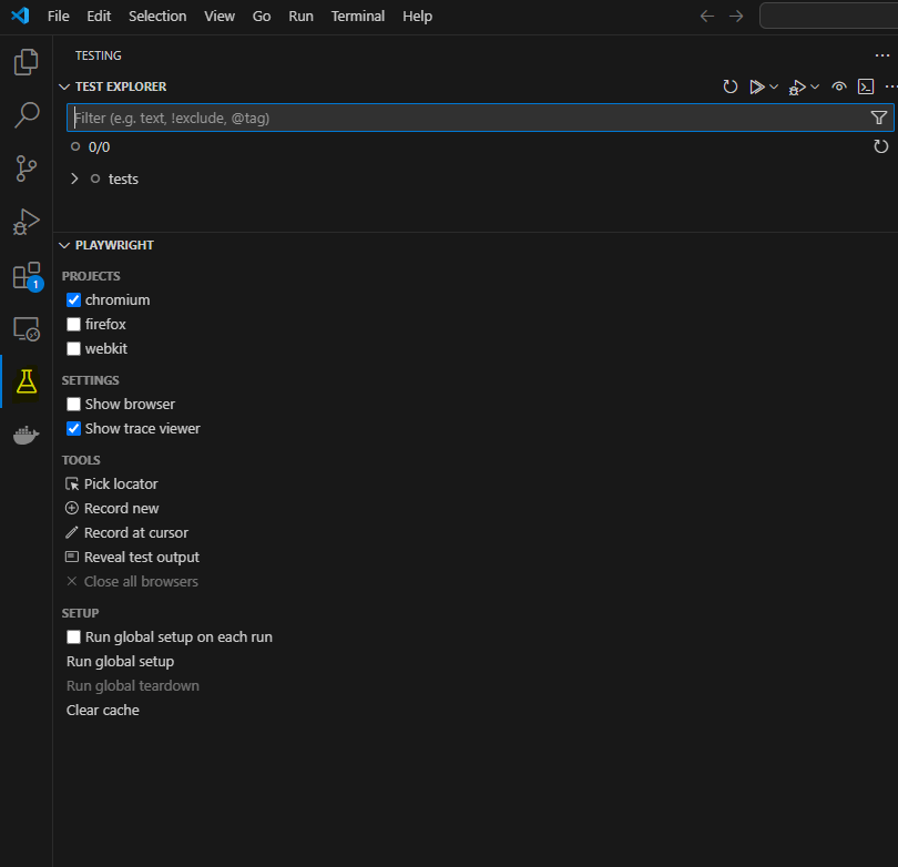 On the left sidebar of VS Code, open the Testing section, where you’ll find the Playwright options. - Select Browsers for Testing